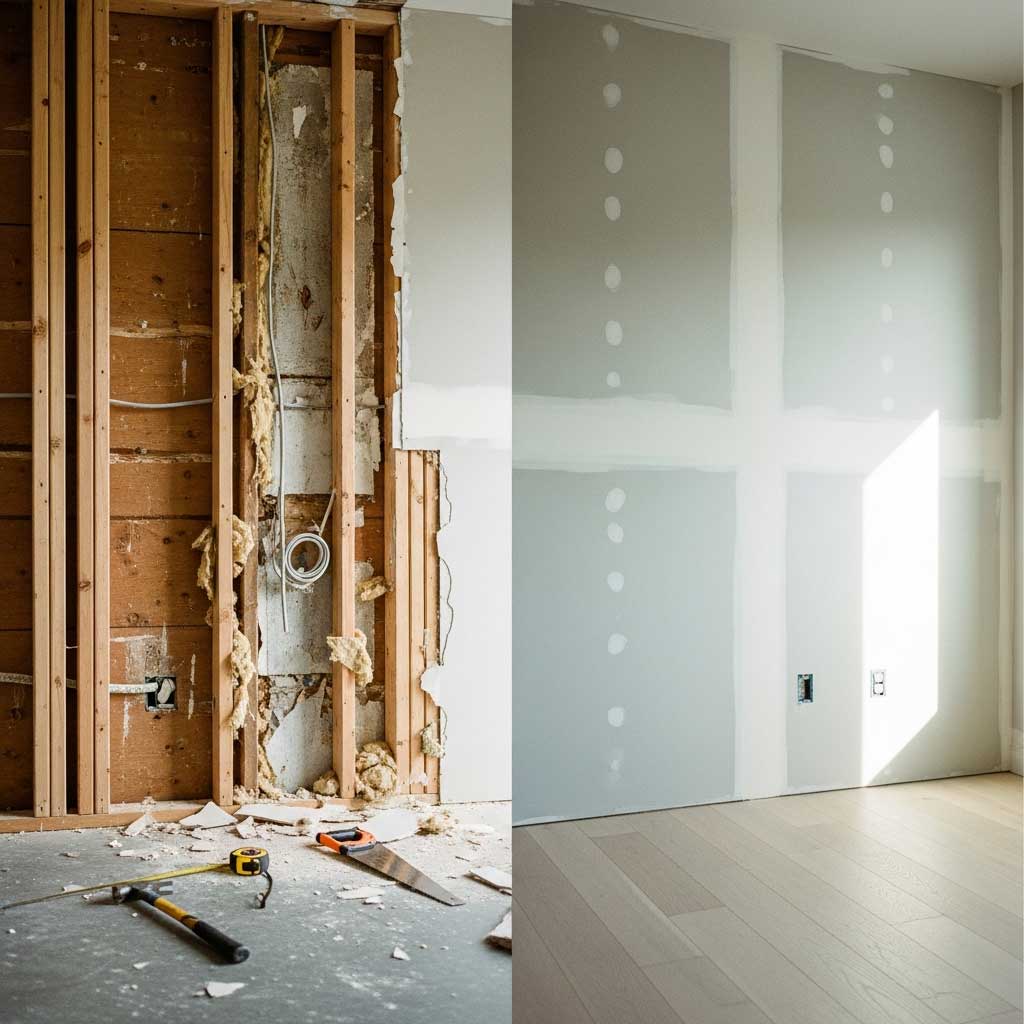 We rebuild the interior with new drywall, insulation, trim, doors, baseboards, and high-quality finishing work.